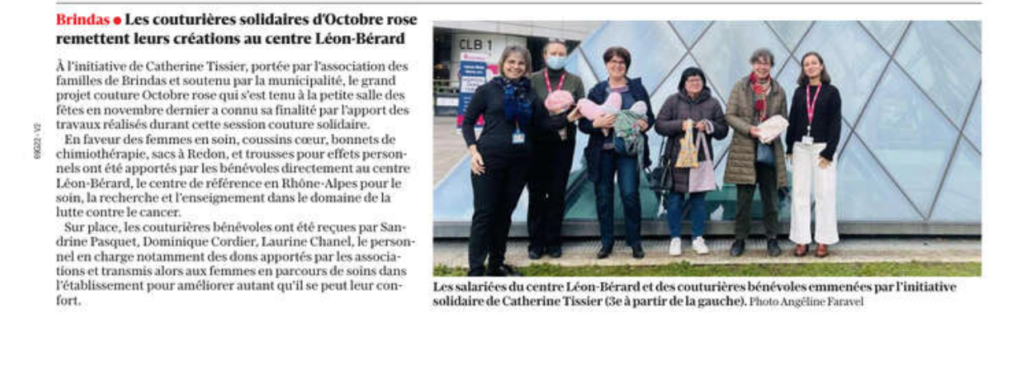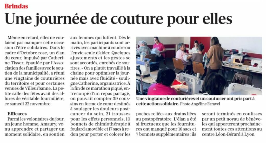 Octobre rose en novembre. L’une de nos adhérentes nous avais fait part de son projet d’aider les malades. Nous avons décidé, avec le soutien de la mairie, de l’accompagner dans son initiative d’organiser une journée dédiée à cette cause. Certaines personnes vont marcher, d’autres courir ou même danser et bien nous, nous avons choisi : COUTURE ! Un jour de couture pour confectionner divers articles pour soulager les personnes atteintes de cette maladie. Un grand MERCI à tous les participants qui ont réalisés pleins d’objets à remettre à l’hôpital.